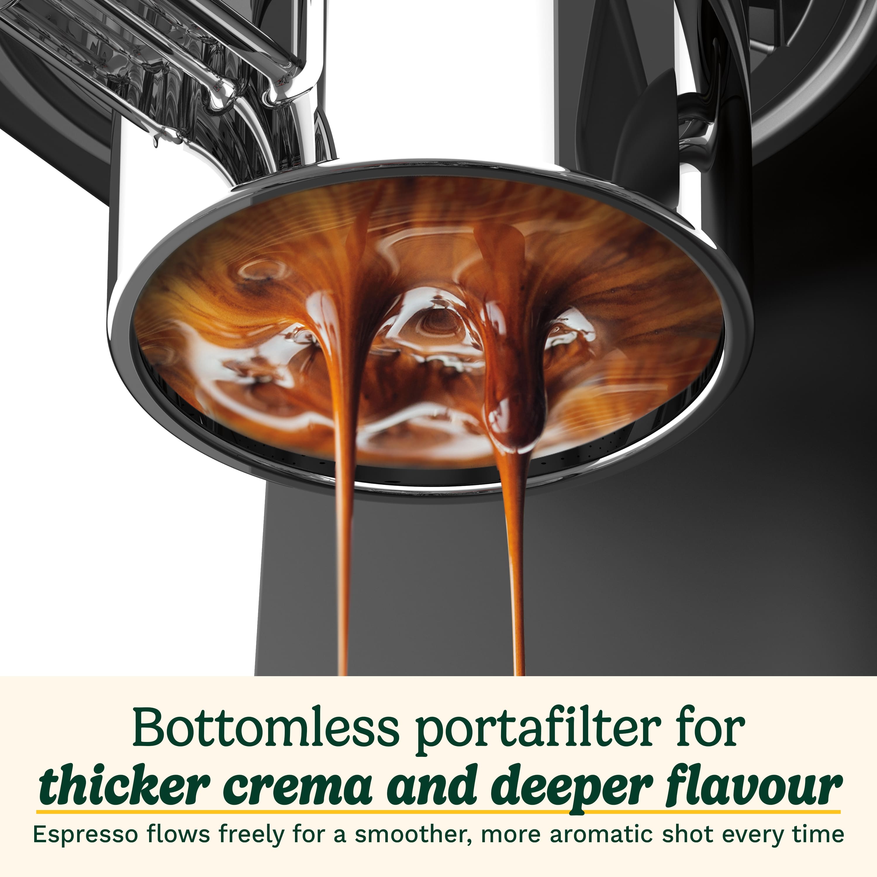 - Bottomless portafilter for richer flavour: Achieve a thicker crema and deeper flavour thanks to the bottomless portafilter that reduces metal contact, letting your espresso flow freely for a smoother, more aromatic shot every time.